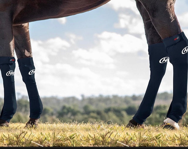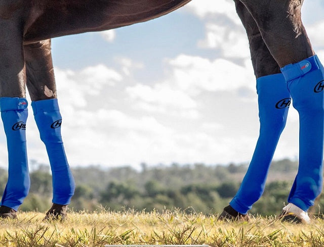 Hidez Compression Socks available in pairs in both front and hind legs use graduated compression. The front socks fit above the knee and hind socks fit above the hock.